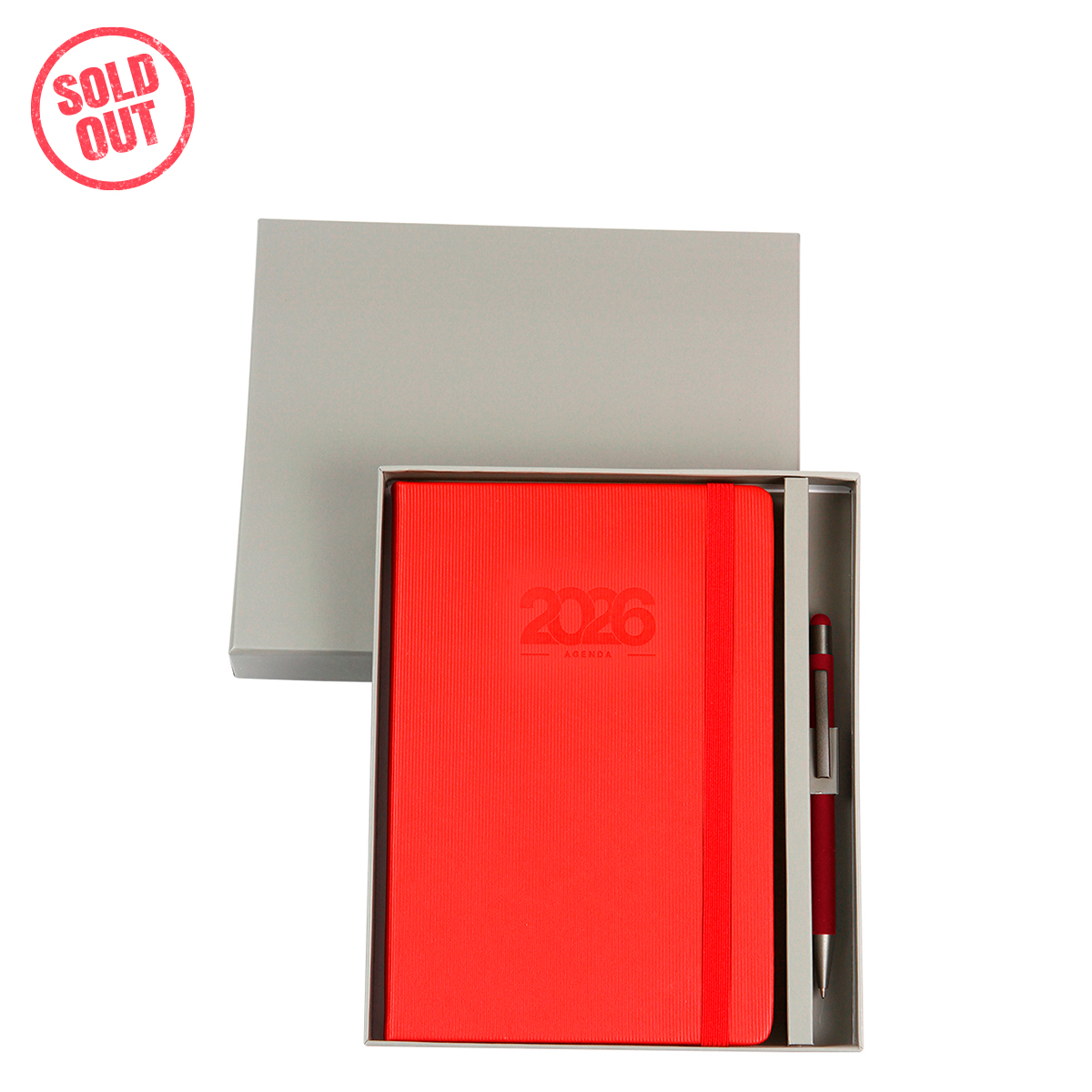 Set de Agenda diaria 2026 con pluma y caja de regalo. Cubierta fabricada en curpiel (PU) con resorte sujetador e interior de 175 hojas de 65 g. (350 paginas) Cada día tiene espacio para tareas importantes y está organizada por horario (5:00 am – 22:00 pm). Cuenta con: Separador de hojas, Calendario anual 2025-2027, planeador mensual, hoja de objetivos anuales, hoja de pendientes mensuales, espacio para notas, tareas, sección de contactos y bolsillo interno para almacenar documentos. Incluye caja de cartón individual y bolígrafo con tinta de escritura negra.
