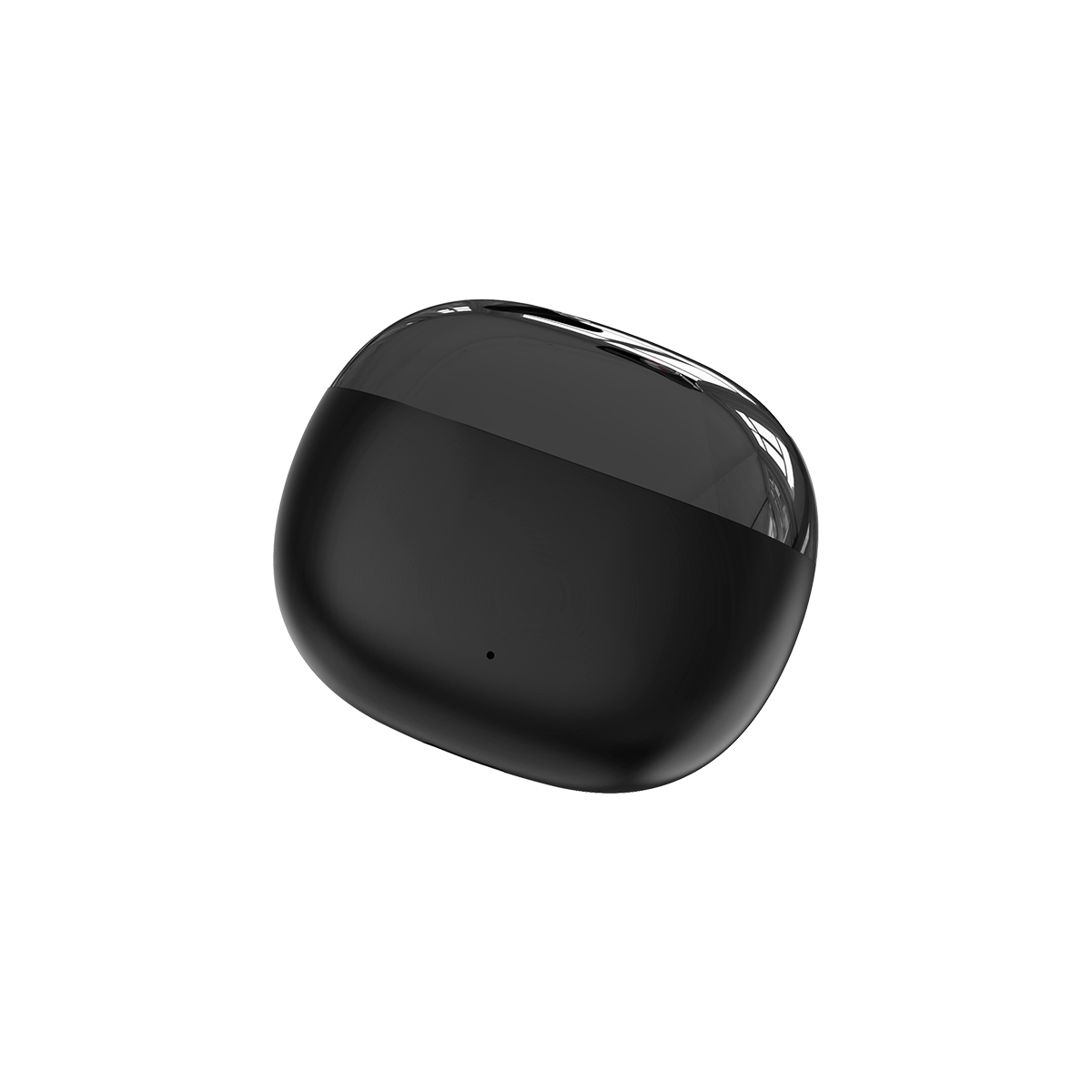 Audífonos con conexión de sonido sin cables bi-tono, en la parte superior con acabado brilloso, y parte inferior con acabado mate, con estuche de carga ovalado, los audífonos tienen un ligero detalle en color plateado en la parte inferior. Incluye cable de carga USB y caja de cartón individual.