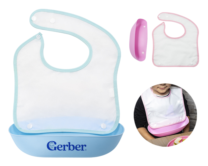 Babero impermeable para bebé de dos piezas, se ajusta de forma segura con broches a presión en el cuello. Incluye un bolsillo removible con broches a presión para atrapar los alimentos, evitando que caigan al piso.
