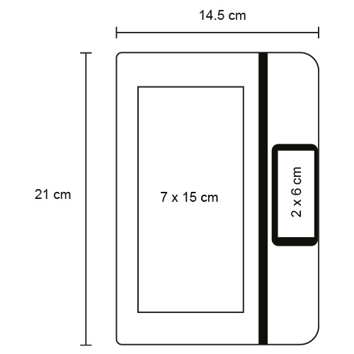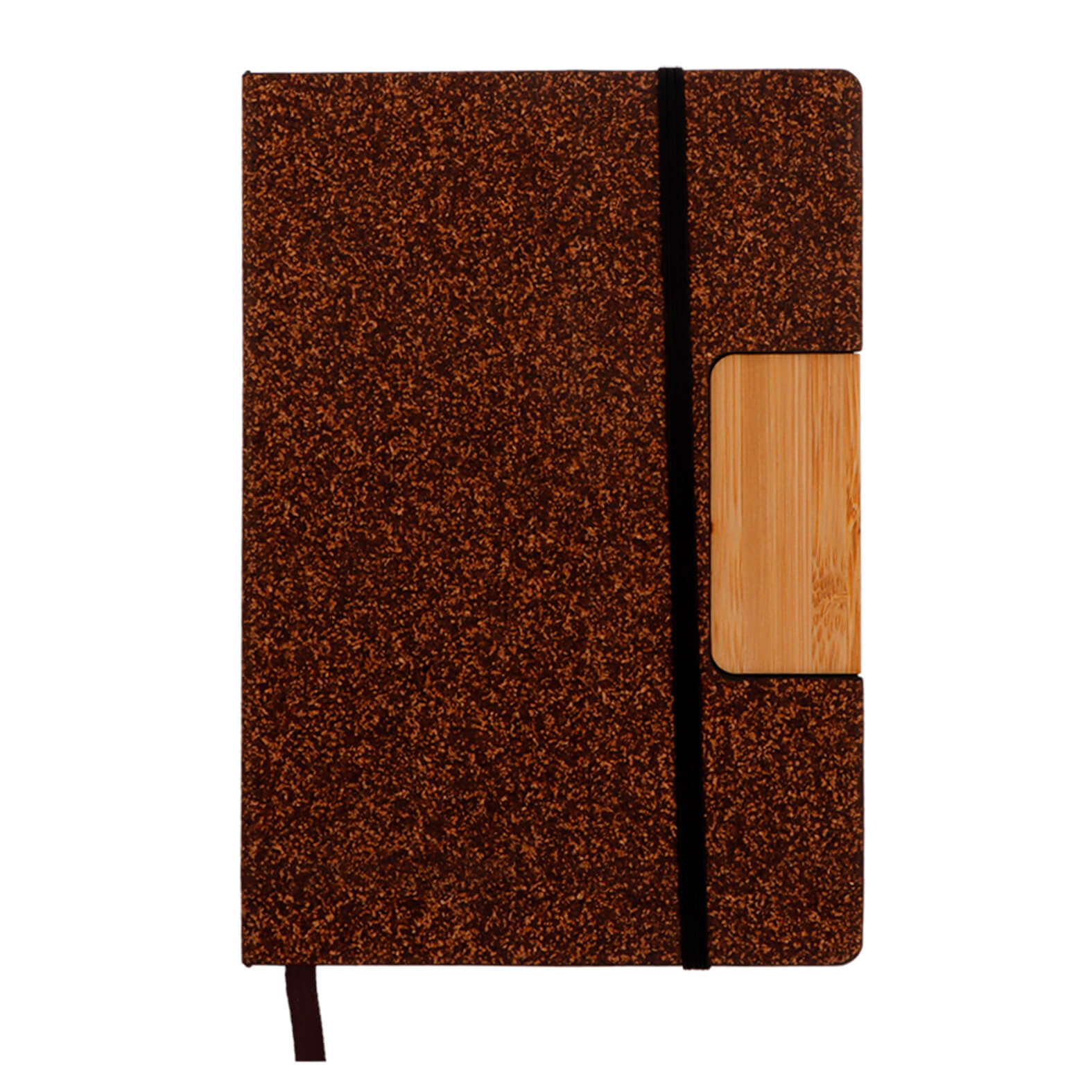 Libreta reciclada de café con 82 hojas de raya, detalle de bambú que sirve cómo soporte para celular, separador y banda elástica.