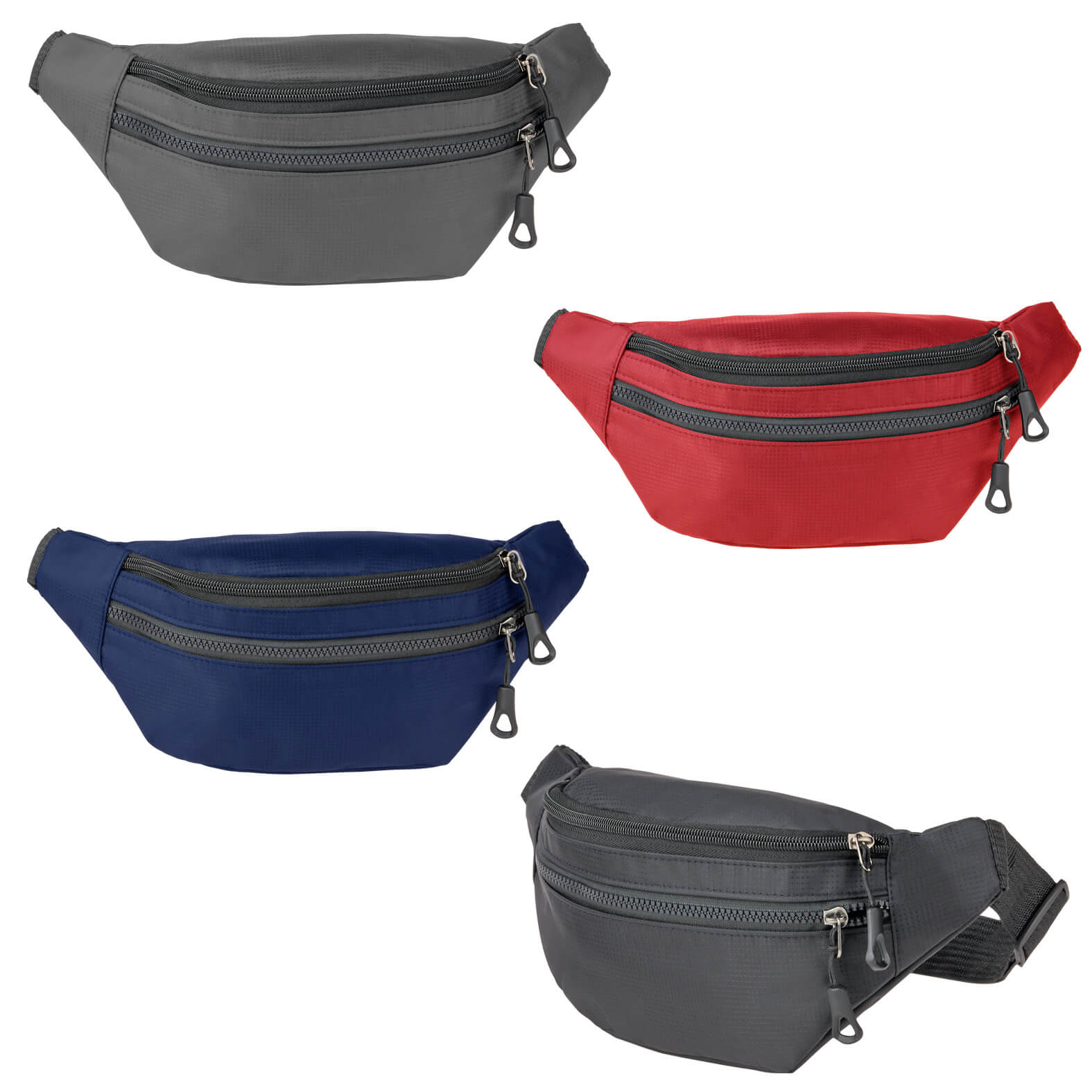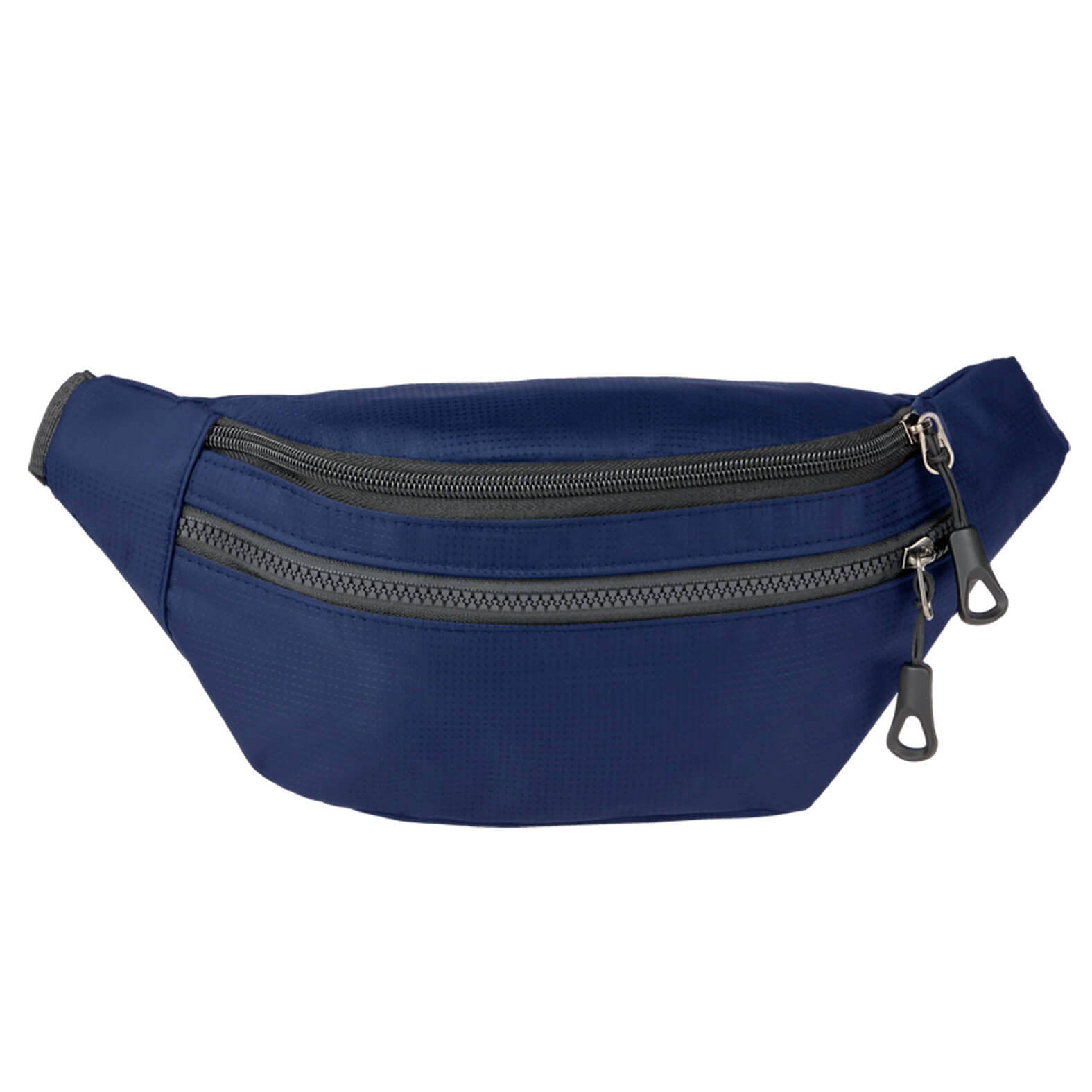 Cangurera de poliéster con compartimento principal, dos compartimentos secundarios con cierre y correa ajustable con broche.
