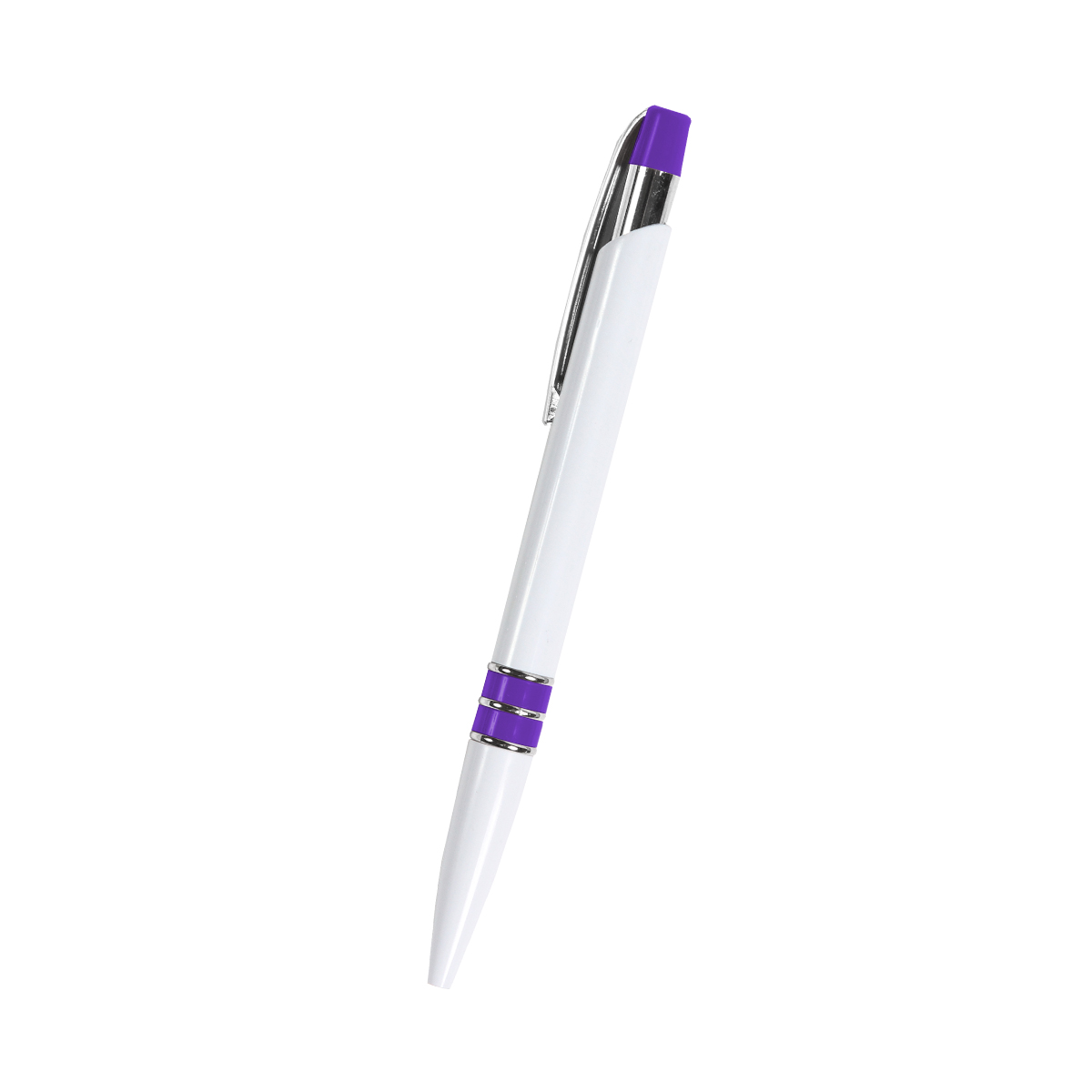 Bolígrafo retráctil de plástico con cuerpo blanco y detalles de color en la parte superior y cerca de la punta. Tinta negra, ligero y funcional para escritura cómoda y práctica en cualquier momento.