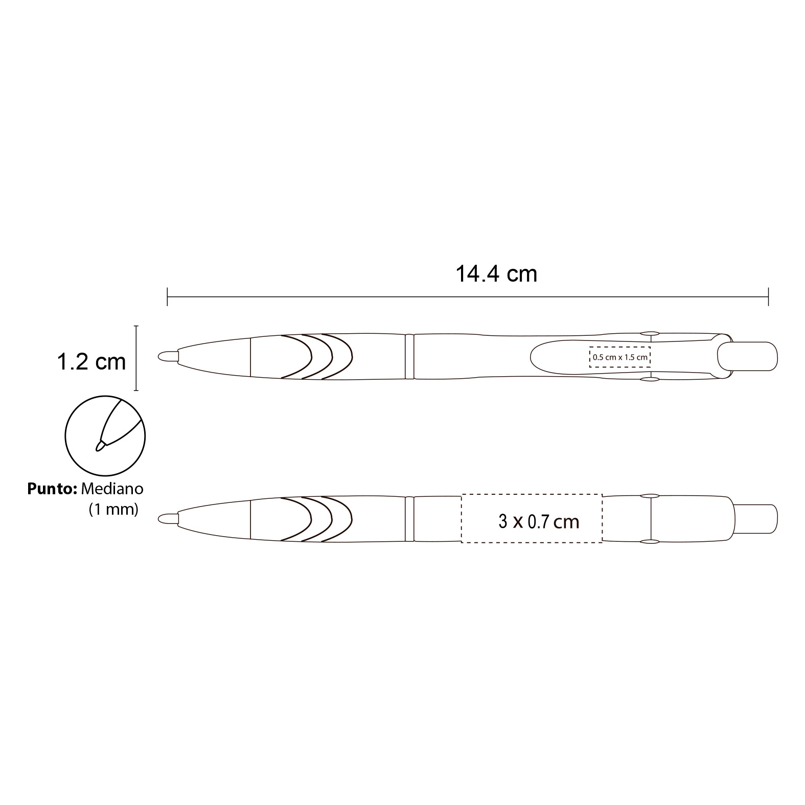 Bolígrafo de plástico de punto medio (1 mm), con grip de goma, clip y mecanismo de click. La compra mínima es de 300 piezas y no se realizan ventas sin impresión.