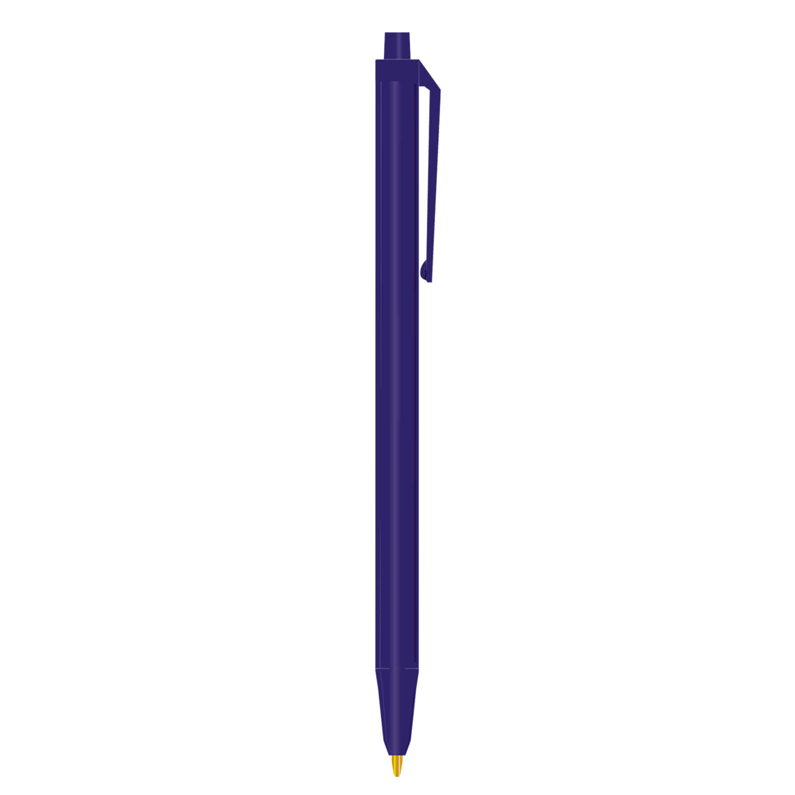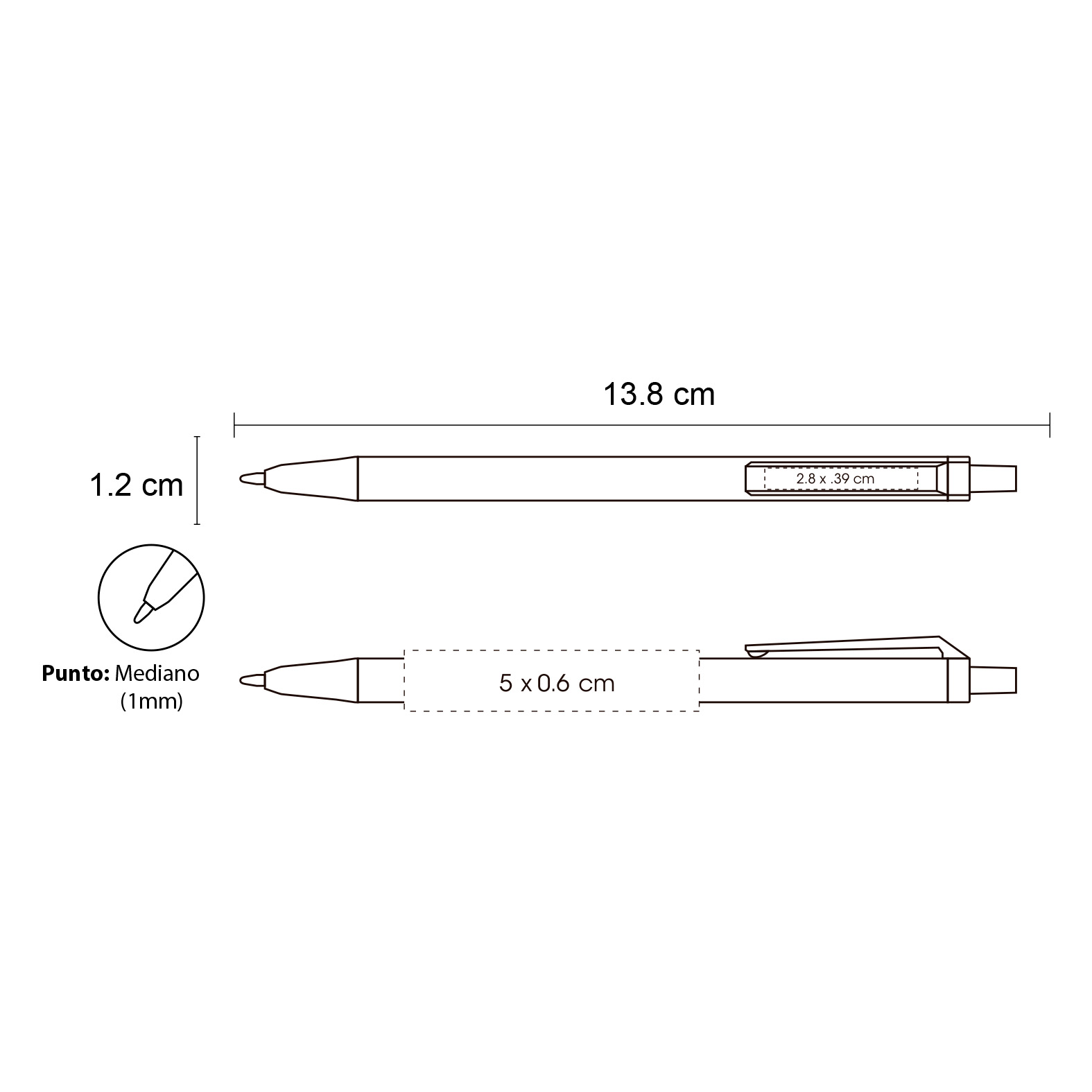 Bolígrafo de plástico de punto medio (1 mm), con clip y mecanismo de click. La compra mínima es de 300 piezas y no se realizan ventas sin impresión.