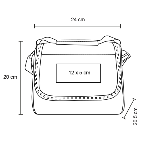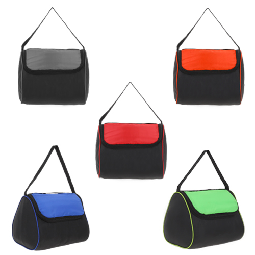 Lonchera de 2 compartimentos, interior plastificado, con cierres, asa superior y correa ajustable.