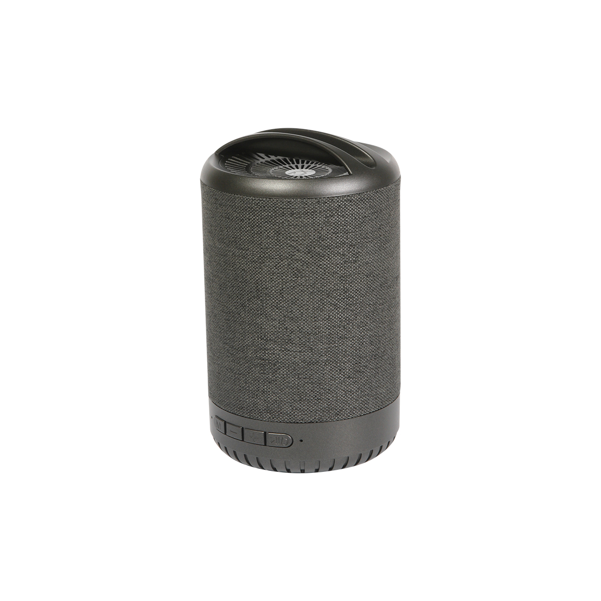Bocina con conexión de sonido sin cables, radio FM, entrada para tarjeta TF y memoria USB, fabricada en plástico ABS con cubierta de tela y soporte para celular en la parte superior. En la parte inferior se encuentran 4 botones para manipular la musica, carga a través de cable USB (incluido). Incluye caja de cartón individual.