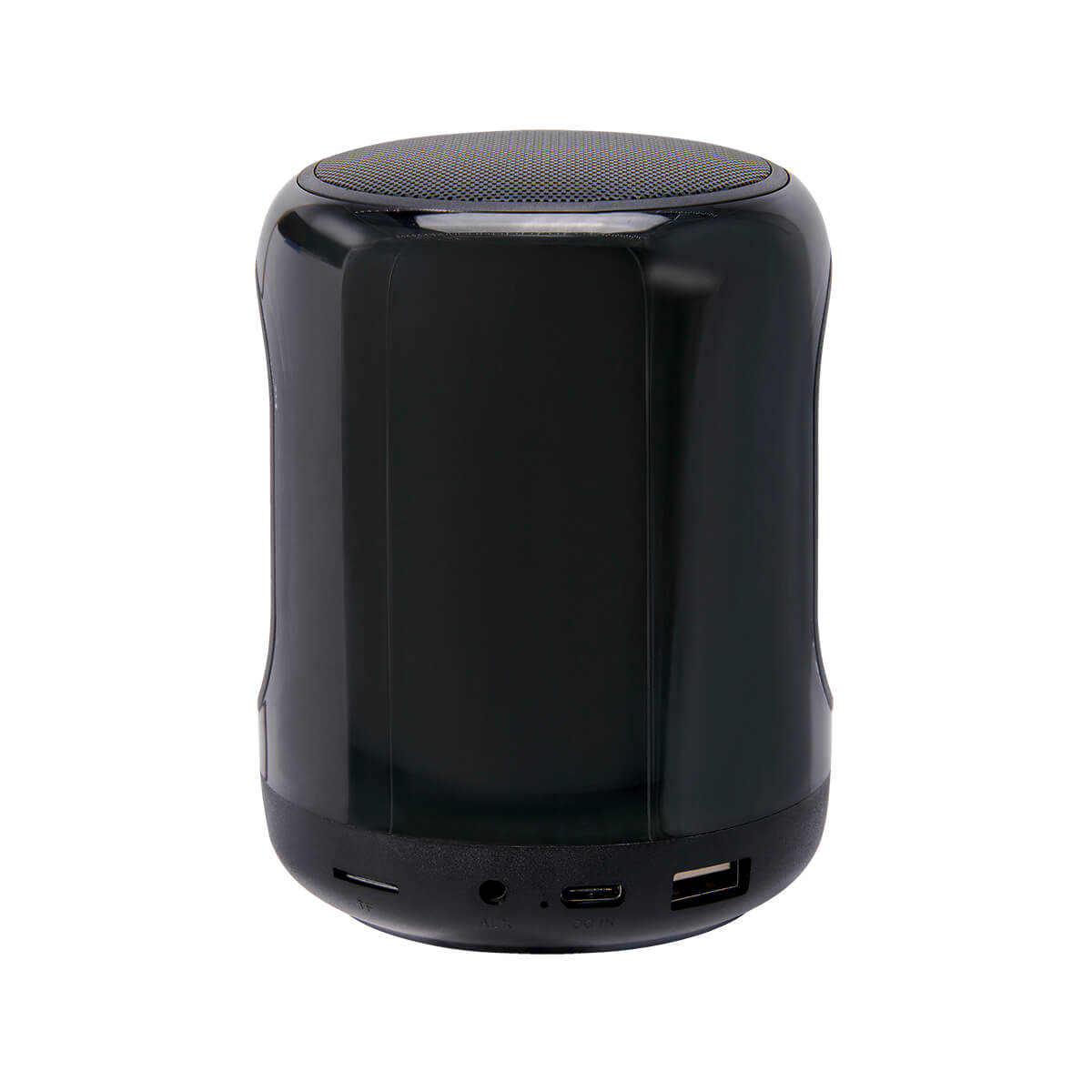 Bocina bluetooth recargable con luz RGB ajustable a 10 efectos diferentes. Reproducción de música 4 hrs aproximadamente. Rango de conexión 10 metros. Cuenta con puerto para tarjeta TF, puerto USB, puerto auxiliar 3.5 mm y puerto tipo C. Radio FM. Incluye cable cargador USB.