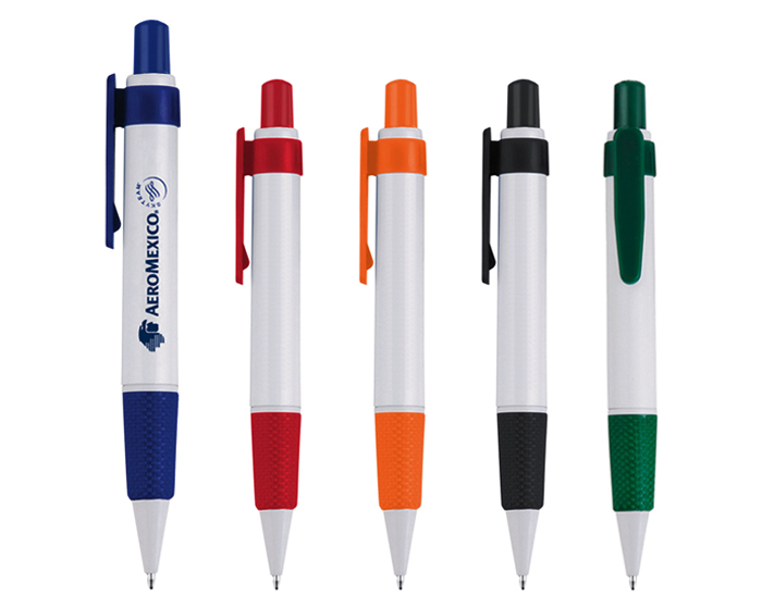 Bolígrafo plástico con cuerpo en color blanco, grip antideslizante y clip de color. Mecanismo de click.