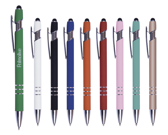 Bolígrafo de aluminio con recubrimiento de goma. Con detalles y clip metálico. Punta touch y mecanismo de click.