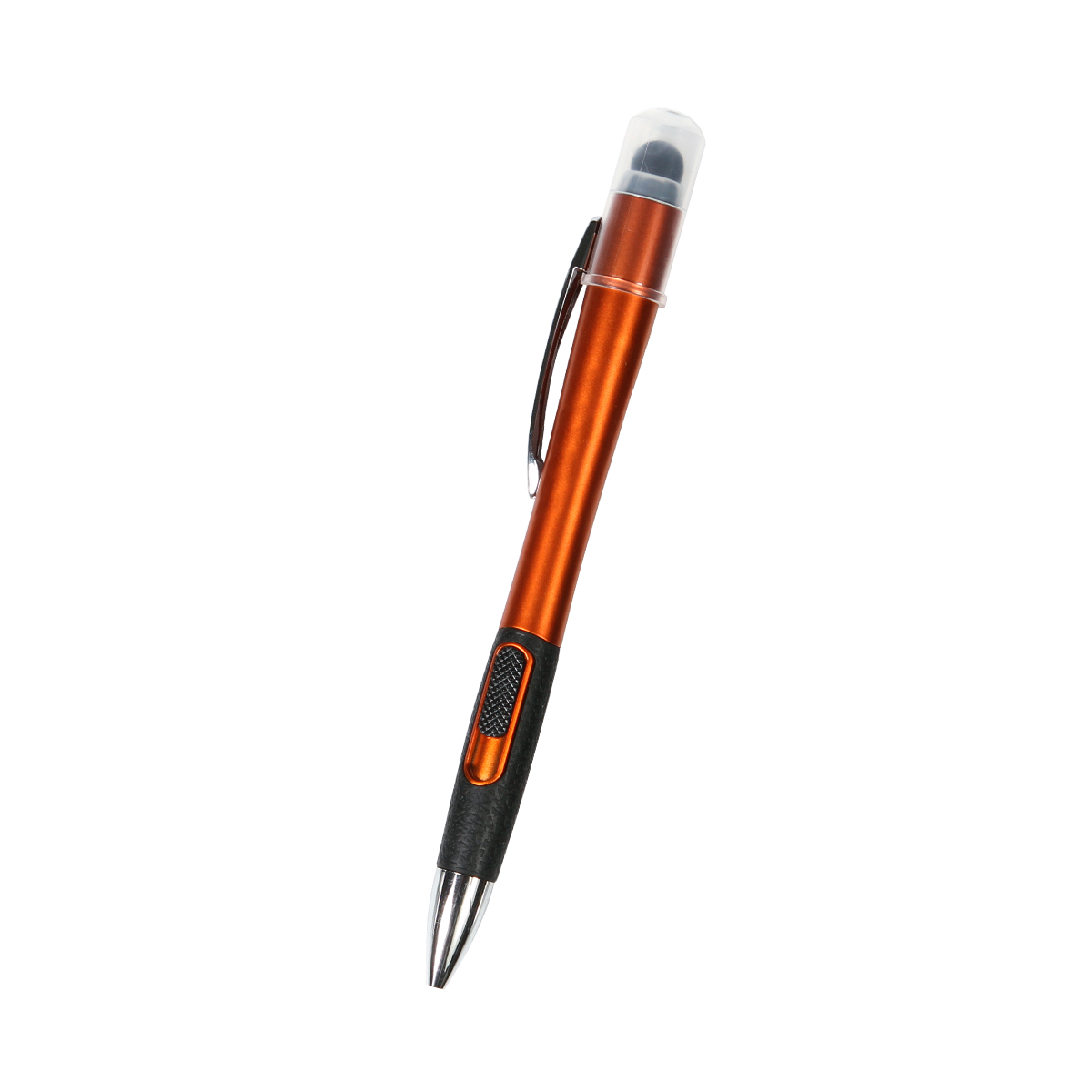 Bolígrafo retráctil fabricado en plástico con apariencia metálica, luz interior del color del barril, puntero touch y tinta de escritura negra.