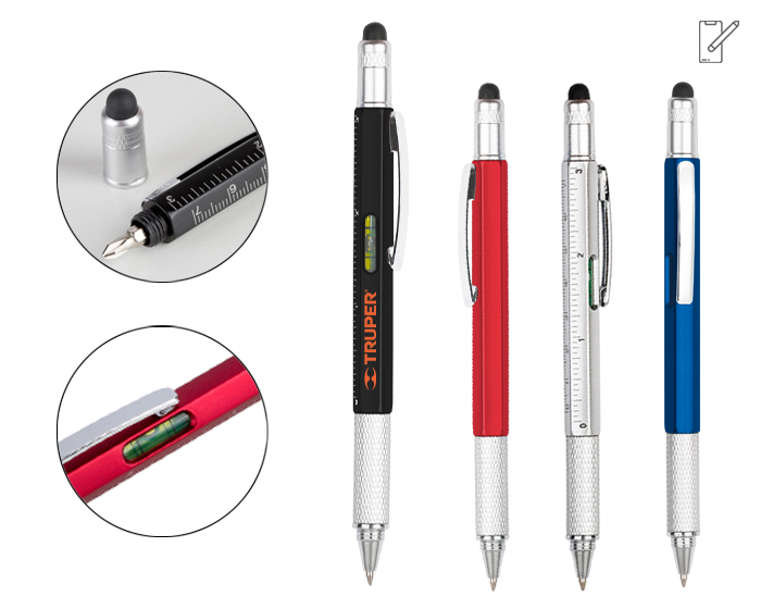 Bolígrafo de plástico 6 en 1, diseño de cuerpo hexagonal que cuenta con regla de 7 cm y 3 pulgadas, nivelador y clip de metal. Puntero para pantallas táctiles. Incluye punta destornillador plano y de cruz, que se guarda y fija en el cuerpo de la pluma. Mecanismo retráctil.
