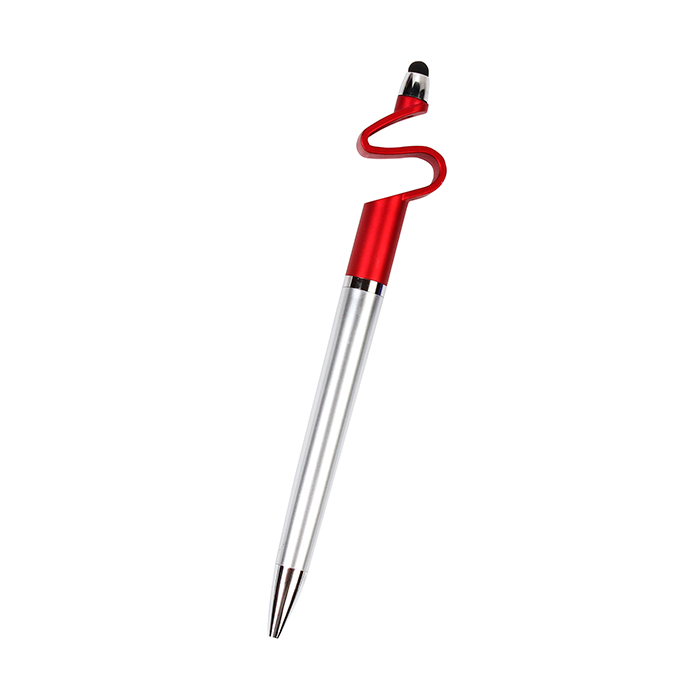 Bolígrafo de plástico con acabado metálico, puntero touch y base superior diseñada para sostener el celular. Tinta de escritura negra, combina funcionalidad y estilo.