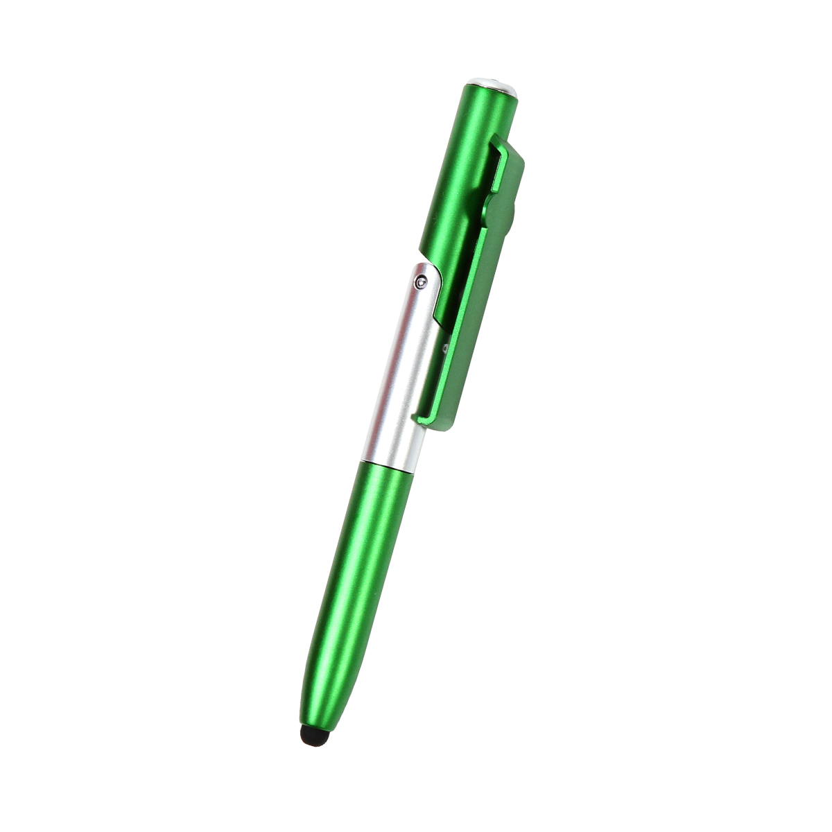 Bolígrafo de plástico con acabado metálico, lámpara, puntero touch y la parte superior que se dobla para funcionar como base para celular. Tinta negra, combina innovación, funcionalidad y estilo.