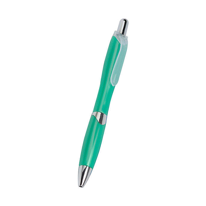 Bolígrafo de plástico con accesorios plateados y tinta negra. Diseño ligero y práctico, ideal para uso diario o como artículo promocional.