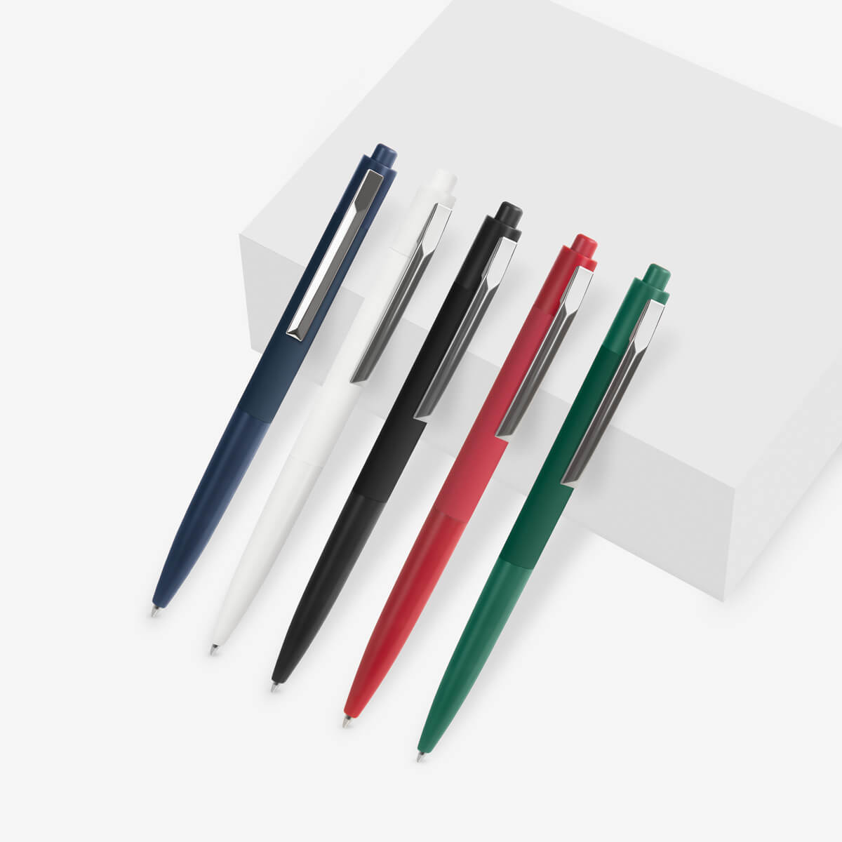 Bolígrafo híbrido: mitad metálica y mitad de plástico. Acabado suave al tacto y mecanismo pulsador.