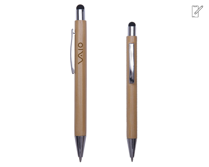 Bolígrafo de bambú, clip y punta metálico. Con punta touch para pantallas táctiles. Mecanismo de click.