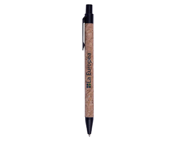 Bolígrafo de corcho con mecanismo de click. Cuenta con botón, clip y punta en color.