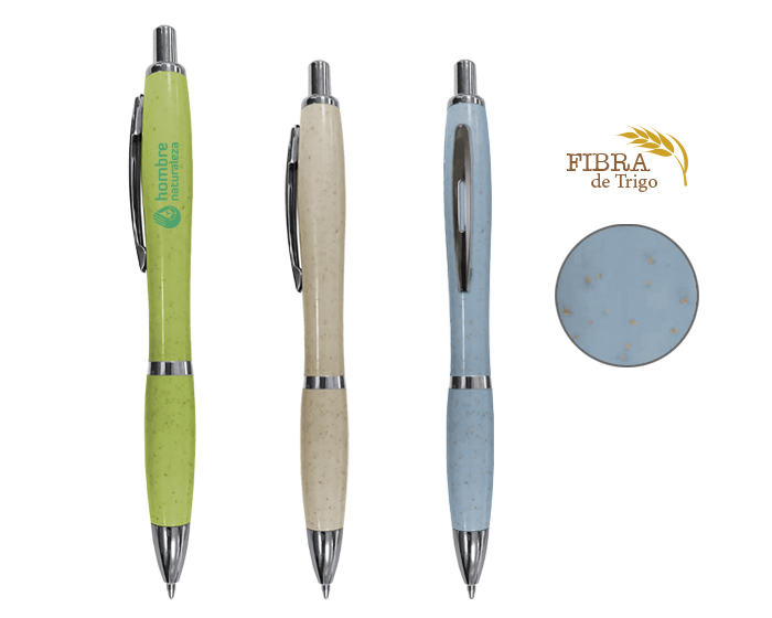 Bolígrafo ecológico y reciclable, con cuerpo de plástico ABS y “fibra de Trigo”, tiene clip metálico, cuenta con punta, clip y detalle al centro en color cromo. Mecanismo de click.