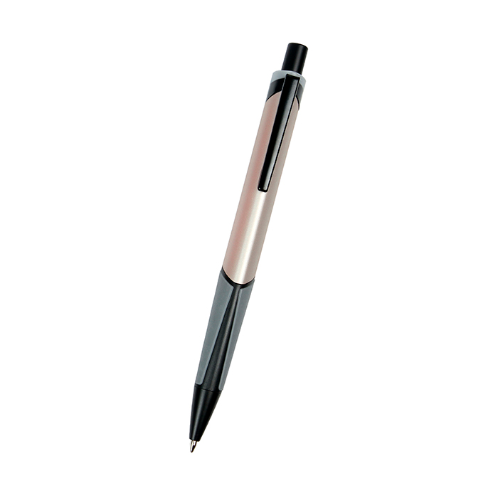 Bolígrafo retráctil fabricado en aluminio con forma triangular y grip tipo goma, tinta de escritura negra.