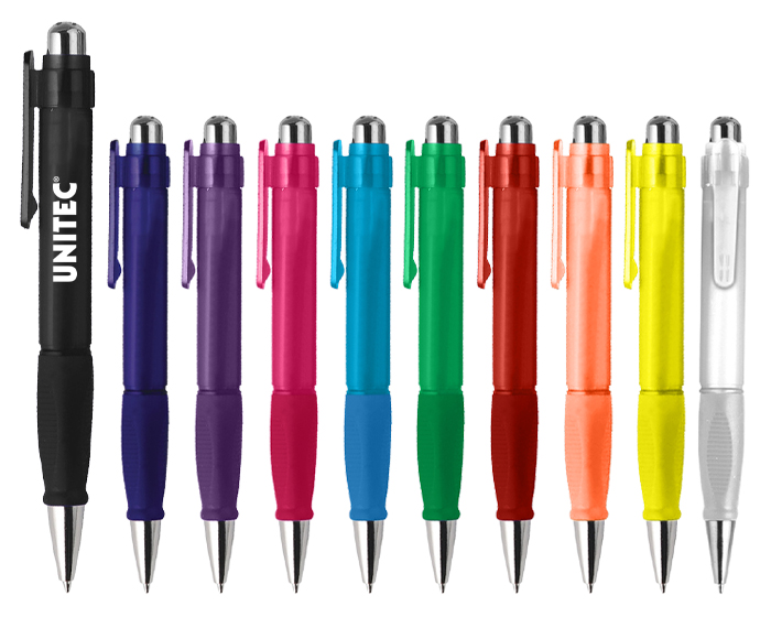 Bolígrafo de plástico en colores traslúcidos, con goma antideslizante y punta cromada. Mecanismo de click.