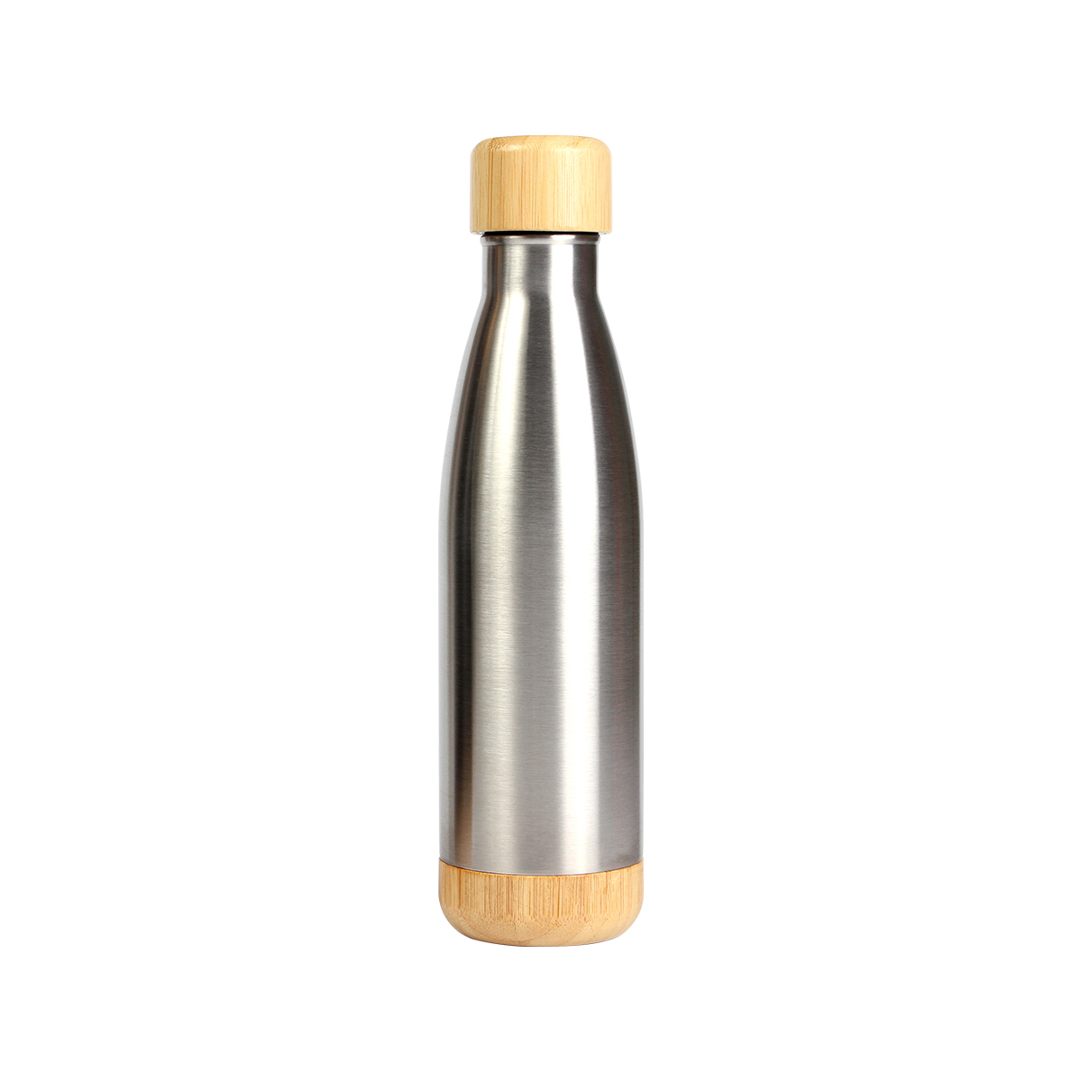Botella plateada fabricada en acero inoxidable reciclado doble pared con tapa de rosca fabricada en bambú y detalles en la base del mismo material. Capacidad de 600 ml, es una opción sostenible y elegante para mantener tus bebidas frías o calientes mientras contribuyes al cuidado del medio ambiente. No usar en microondas, incluye caja individual