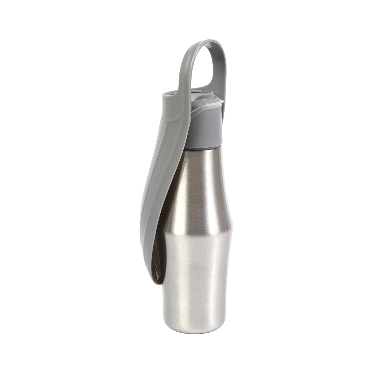 Botella de agua para mascotas fabricada en acero inoxidable y polipropileno. Con asa y diseño ergonómico que te permite transportarla a cualquier parte. Cuenta con un botón de liberación rápida y con un recipiente de agua plegable para que tu mascota tome agua fácilmente. Capacidad de 750 ml, Incluye caja individual.