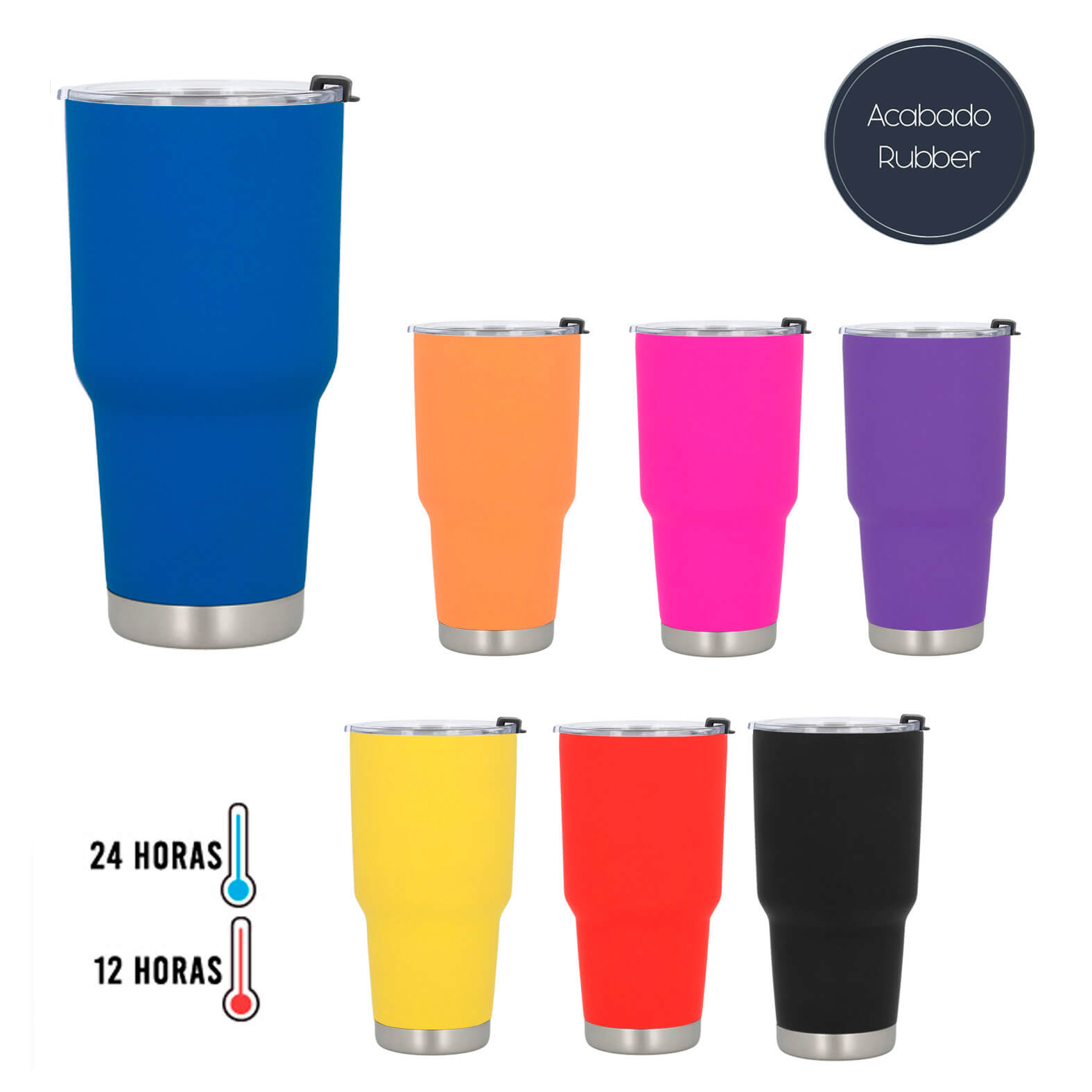 Termo de alta tecnología, con acabado rubber, doble pared de acero inoxidable que mantiene tus bebidas calientes y frías por más tiempo. Incluye tapa de presión transparente.