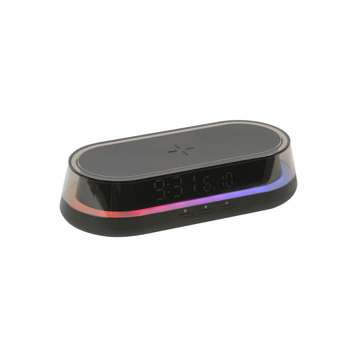 Cargador inalámbrico multifuncional para teléfono celular 15W. Con reloj y función de alarmas, incluye una lámpara de luz blanca en tres niveles y luz tipo RGB (colores). Diseño ergonómico especializado para escritorio y/o buró.
