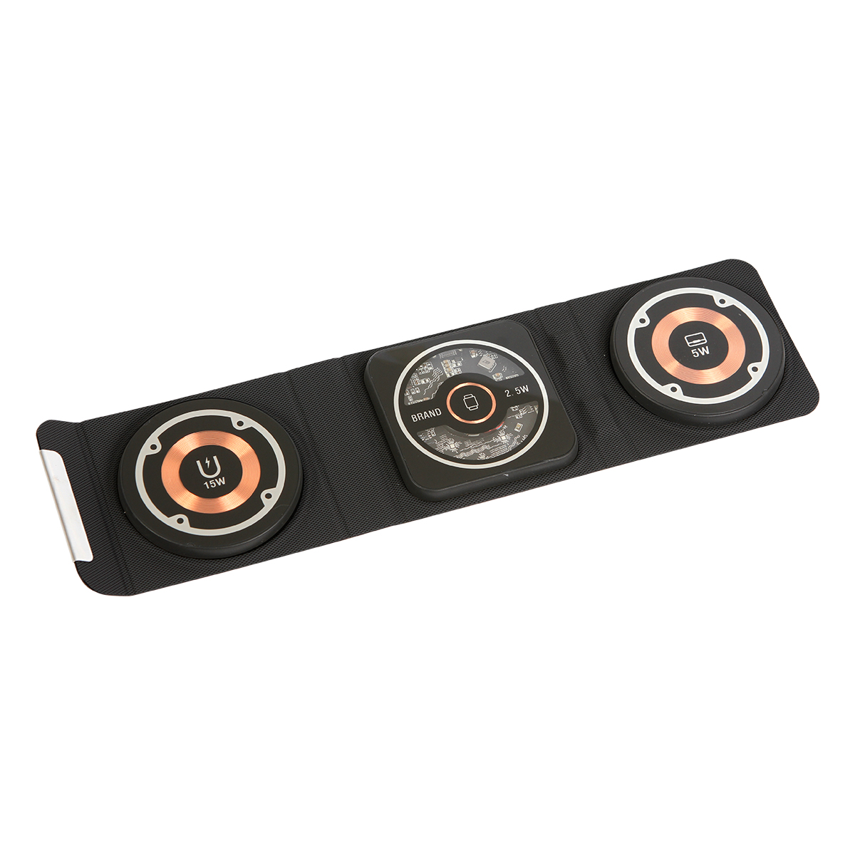 Cargador magnético para casa, oficina o viaje 3 en 1 plegable wireless de 15 w, material plástico ABS+PU, para celular, audífonos y reloj, carga rápida, multi función, compacto y fácil de transportar.