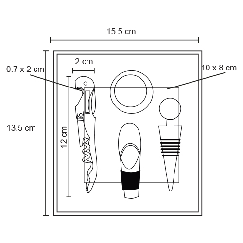 Set de vinos con 4 accesorios: sacacorchos, boquilla, tapón para vino y corta gotas. Incluye estuche.