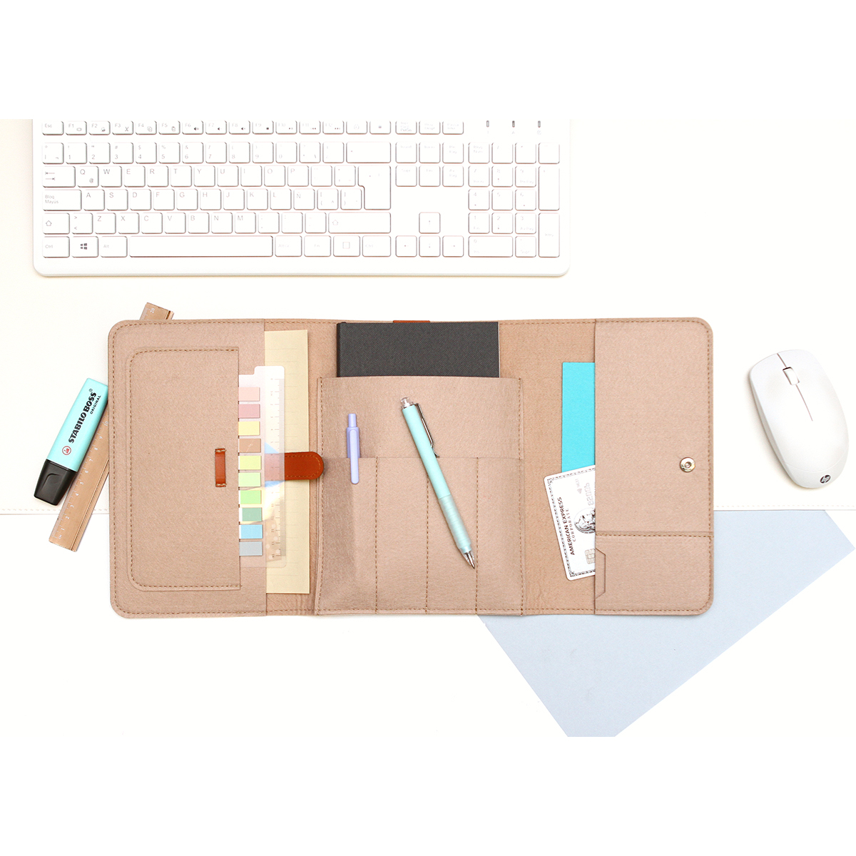 Organizador fabricadao en fieltro, con cierre de broche. Incluye cuatro compartimentos internos para documentos u otros objetos. Además de compartimentos para bolígrafos o lapiceros y espacio para guardar tarjetas.
