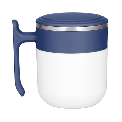 Termo de doble pared con interior de acero inoxidable y exterior de plástico, tapa de cierre a presión y asa de plástico.