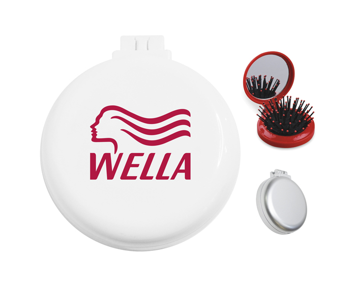 Estuche plegable de plástico, con cepillo retráctil y espejo.