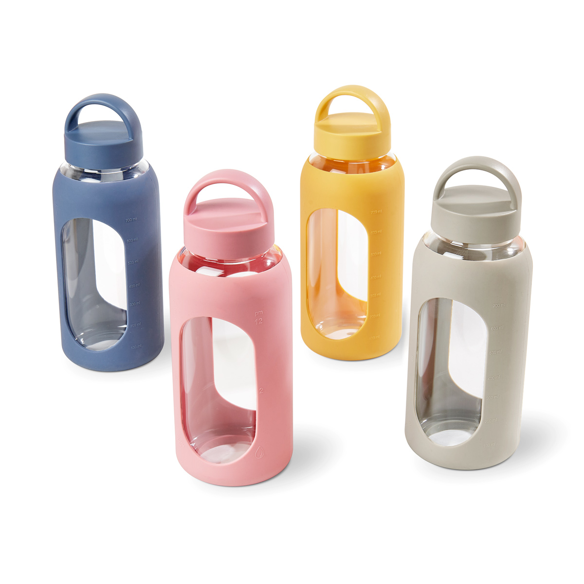 Cilindro de vidrio con manga de silicón graduada en ml. Tapa de plástico con sistema de rosca y asa. Vidrio resistente a bebidas calientes y frías. Incluye caja individual.