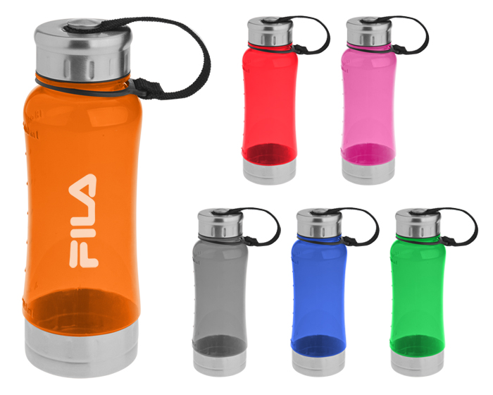 Cilindro deportivo de plástico y acero inoxidable con tapa de rosca y correa. CAP. 500 ml. *BPA FREE.