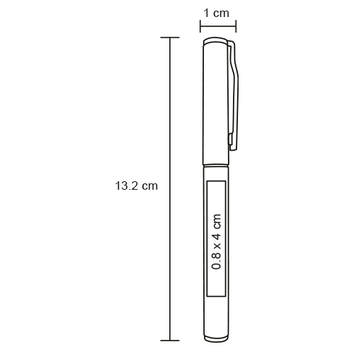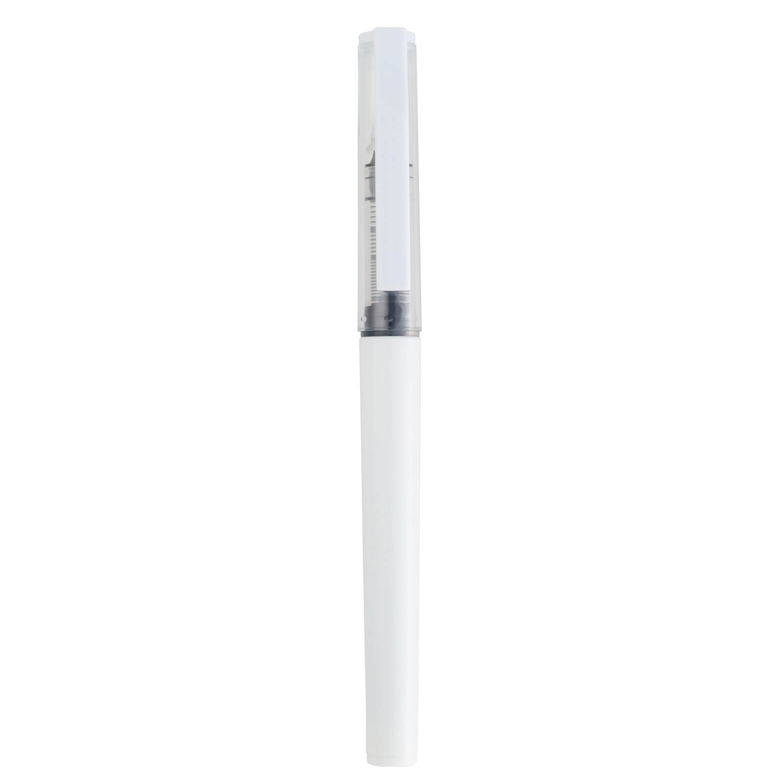 Bolígrafo de plástico con tinta negra de gel, tapa traslúcida y clip de plástico.