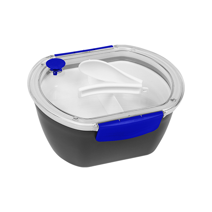 Contenedor para alimentos con base en color negro fabricada en AS y tapa translúcida de silicona, cuenta con accesorios de colores que le dan un aspecto atractivo y moderno. Además, los compartimentos internos y la cuchara incorporada te brindan comodidad y versatilidad en el transporte y consumo de tus alimentos.