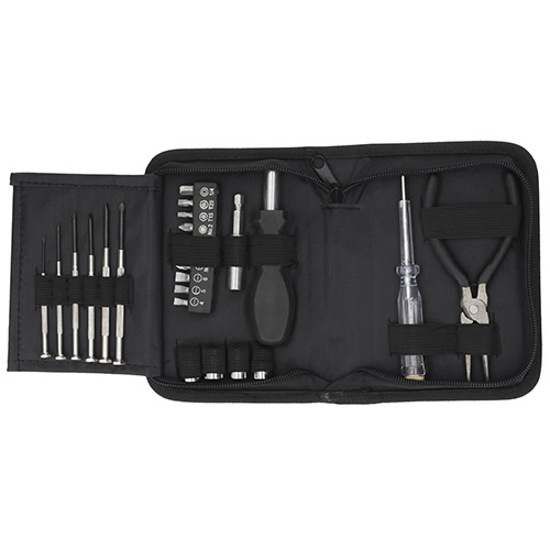 Set de herramientas en estuche de poliéster que contiene 23 piezas: Desarmador plano con probador de corriente, pinzas de punta, 4 dados, 1 desarmador con extensión y adaptador para 9 puntas intercambiables y 6 desarmadores de precisión.