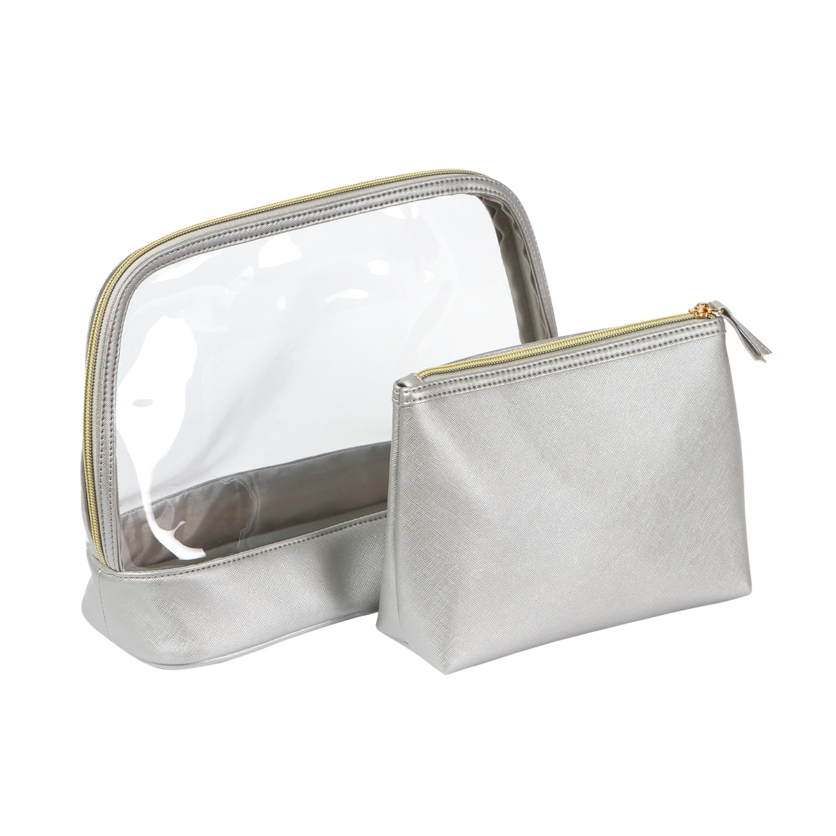 Organiza tus esenciales de belleza y cuidado personal con este práctico juego de dos cosmetiqueras, ideal para viajes o uso diario. Incluye una cosmetiquera grande fabricada en plástico PVC transparente, perfecta para visualizar y acceder rápidamente a su contenido, con cierre seguro y diseño resistente.