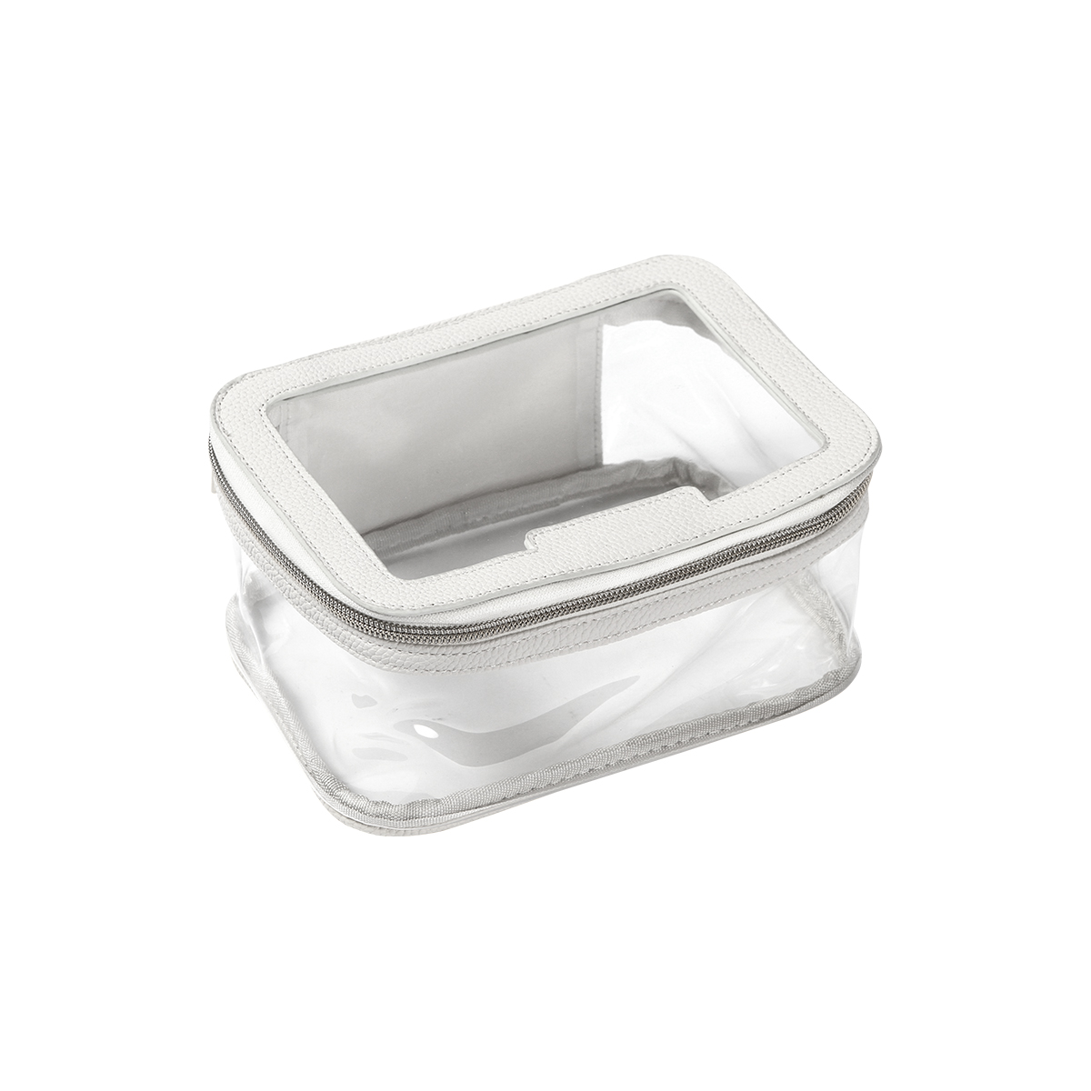 Cosmetiquera fabricada en plástico PVC traslúcida con detalles en PU. Con un compartimento principal con cierre metálico.