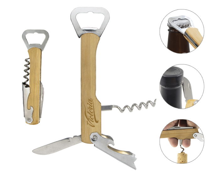 Destapador de bambú 4 en 1 que incluye: 2 destapadores, 1 sacacorchos y una navaja. Presentación: Caja en color blanco.