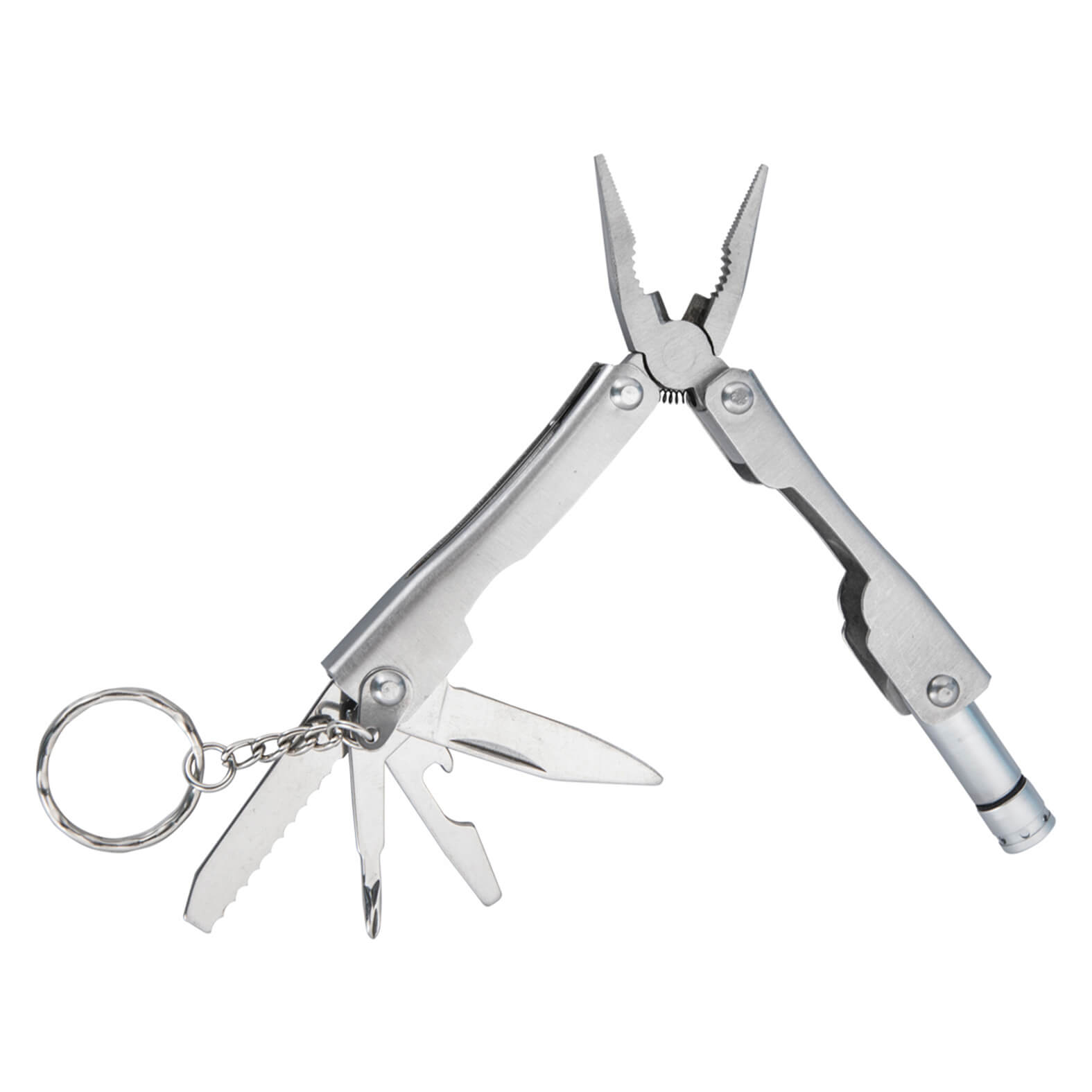 Mini herramienta con 7 funciones, contiene: lámpara de 1 LED, navaja, desarmador de cruz, serrucho, destapador con punta de desarmador plano. Incluye funda y 3 baterías.