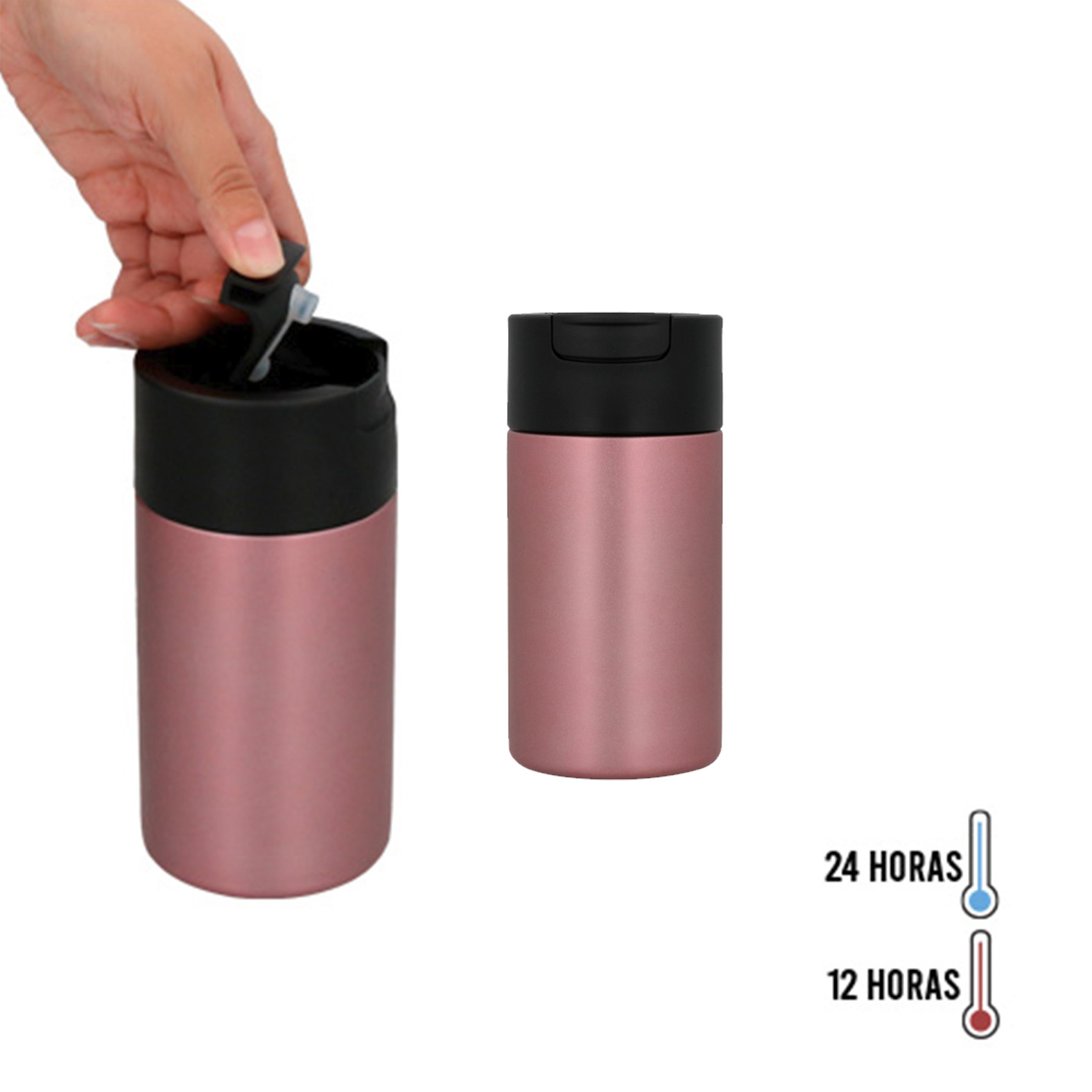 Termo de acero inoxidable y doble pared insulado al vacío con tapa enroscable con boquilla de seguridad.