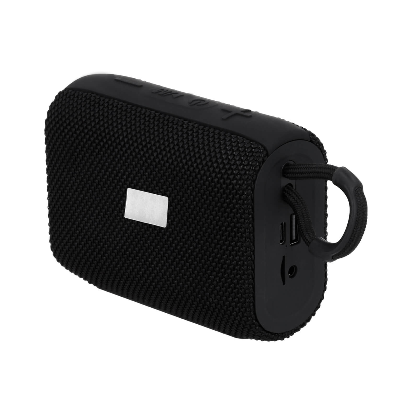Bocina inalámbrica portátil con entrada micro SD, USB, auxiliar y audífonos con mecanismo touch. Incluye cable de carga tipo C.