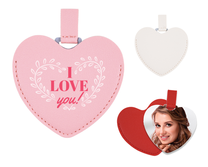 Espejo de acero inoxidable con cintillo y funda de poliuretano en forma de corazón.
