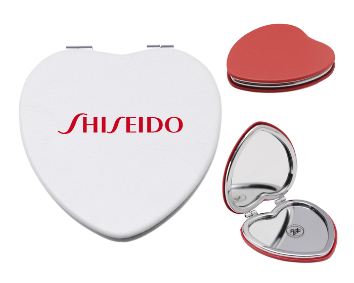 Espejo doble de PU en forma de corazón, detalles en cromo y cierre magnético, cuenta con espejo normal y de aumento (1X/2X).