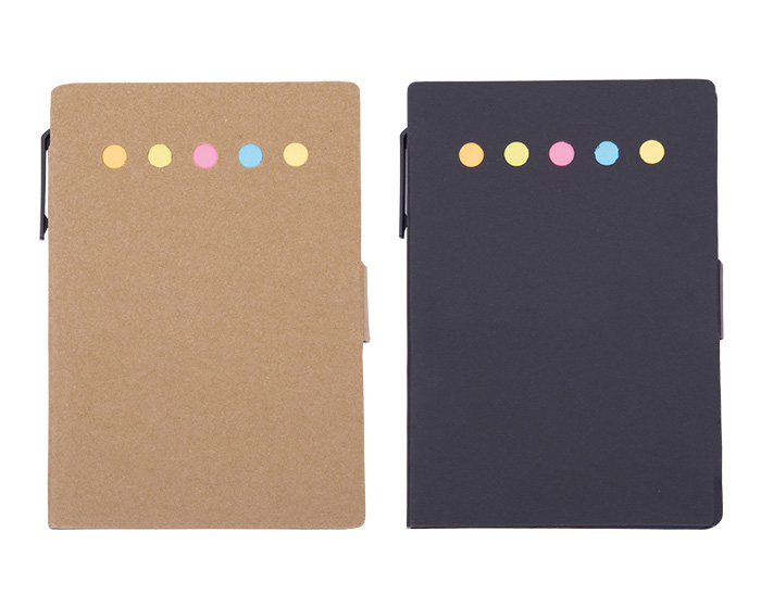Estuche de papel reciclado con block de 60 hojas blancas y banderas adhesivas, incluye bolígrafo de papel reciclado.