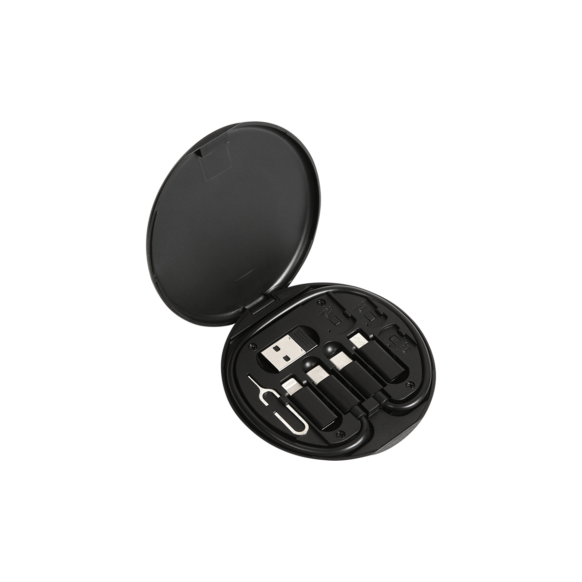 Estuche liviano y portátil multifuncional para almacenamiento que ofrece una solución práctica para necesidades de carga y transferencia de datos, incluye: Cable USB C Macho – USB C Macho, con Adaptador USB A/Micro USB/Lightning con USB.