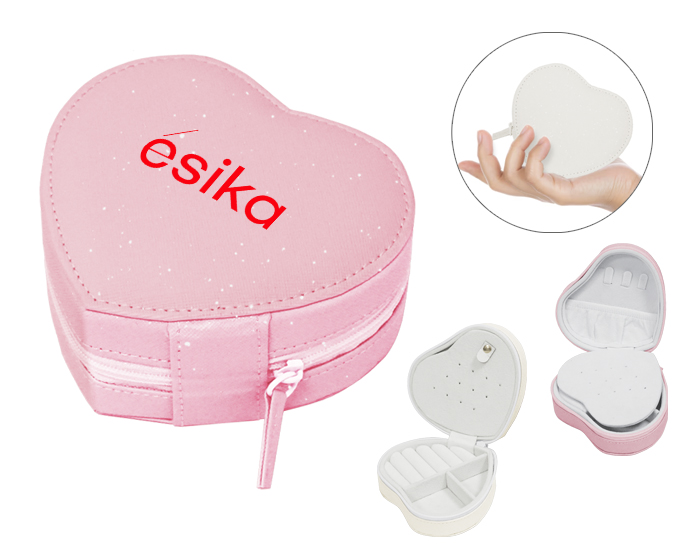 Alhajero portátil en forma de corazón con glitter y cierre. Suave interior tipo terciopelo para mayor protección, cuenta con 3 ganchos para colgar collares o pulseras, bolsa interna con elástico, panel central abatible para 6 juegos de aretes, 5 ranuras para anillos y 2 divisiones para diferentes accesorios.