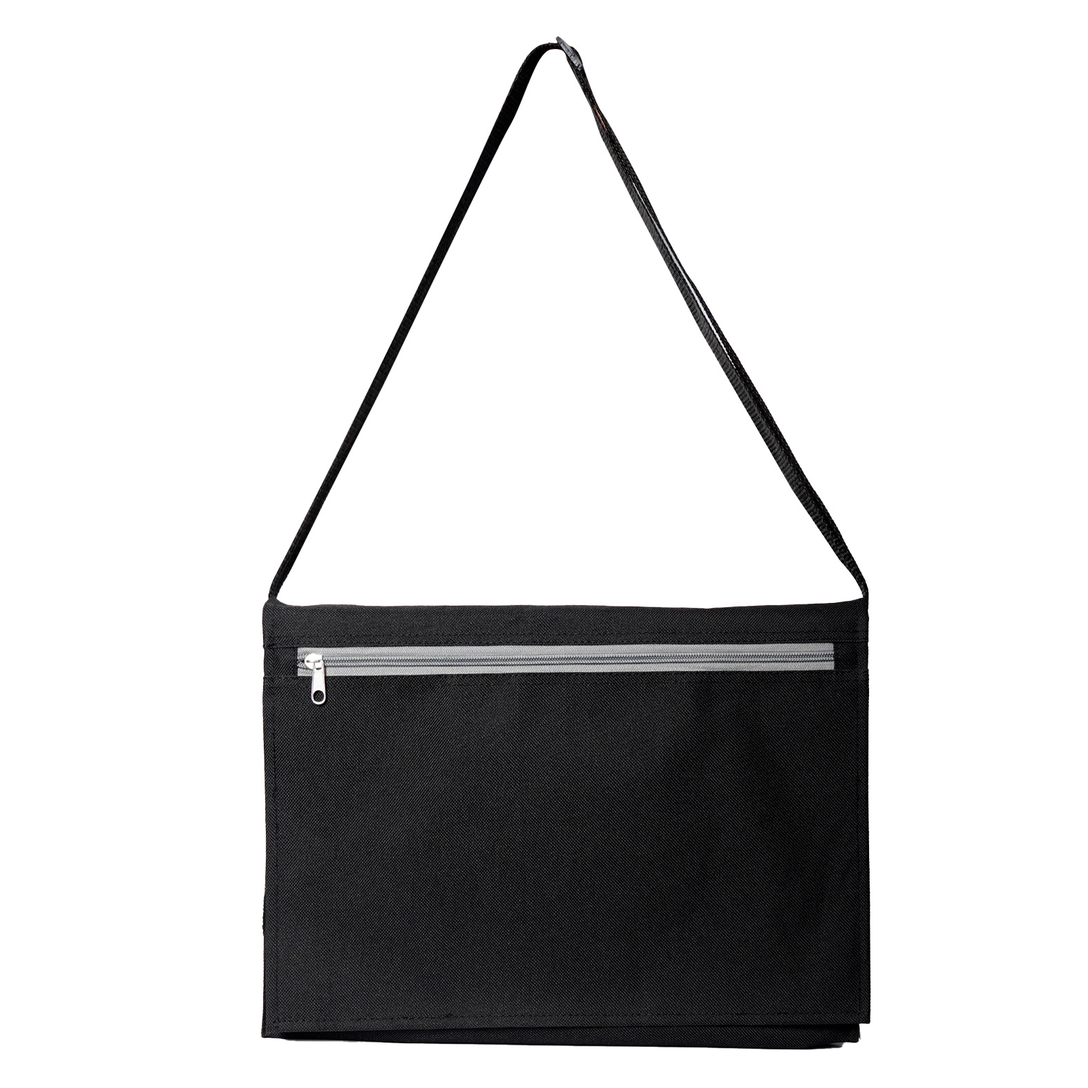 Portafolio con compartimento principal para laptop de hasta 15″, organizador frontal, solapa con cierre de velcro, bolsa trasera con cierre y correa ajustable.